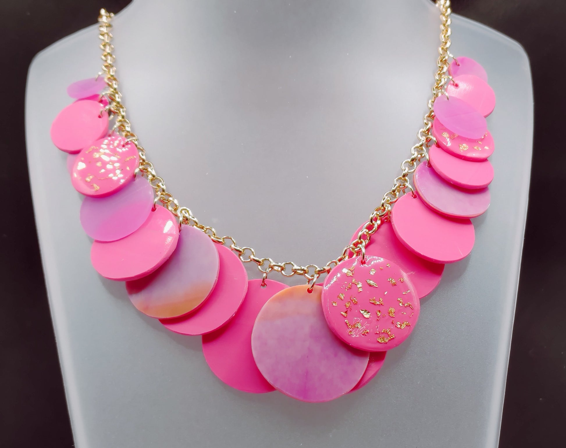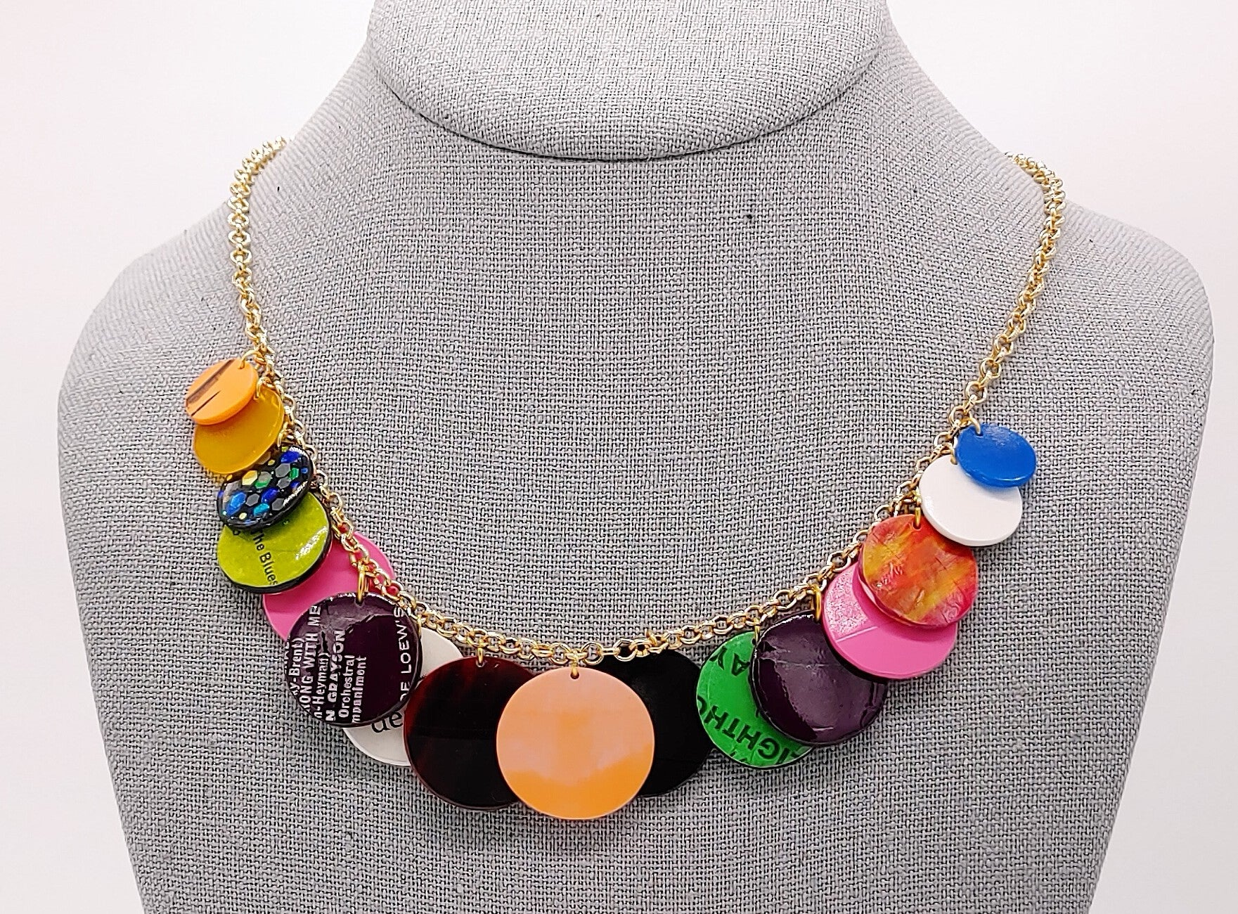 Circle discs of various sizes, graduated around a complimentary colored metal chain. Chain measures approximately 18" plus a 1" extender.